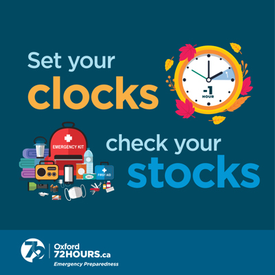 Oxford County is reminding you to “Set Your Clocks, Check your Stocks” this weekend! Time change is an ideal moment to ensure your emergency supply kit is ready at a moment’s notice.