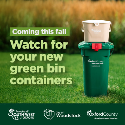 Green bin containers for organic waste collection are being distributed to homes in the Township of South-West Oxford and City of Woodstock this fall ahead of the program start in these communities on January 5, 2026.
