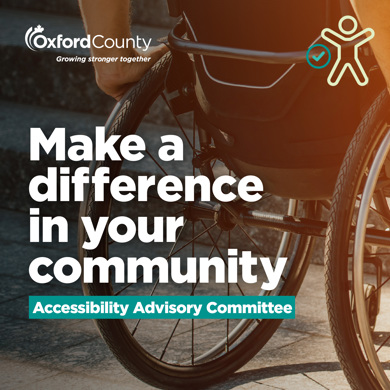 Oxford County invites engaged citizens to join the Accessibility Advisory Committee. There are two citizen member openings for the remainder of the 2023-2026 Oxford County Council term. This Committee of Council provides input on the Oxford County Multi-Year Accessibility Plan, monitors federal and provincial government directives and regulations, and advocates for people living with disabilities in Oxford County.